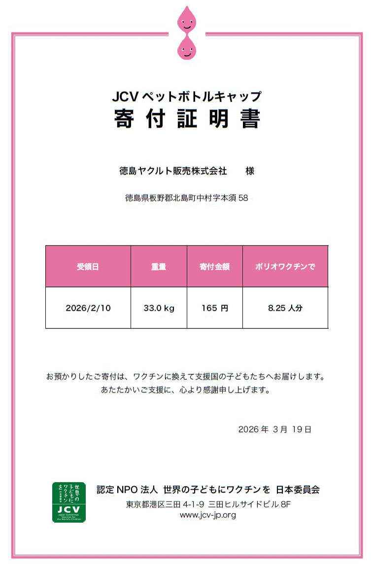 今年度、ワクチン募金として33㎏のペットボトルキャップを寄付いたしました。
